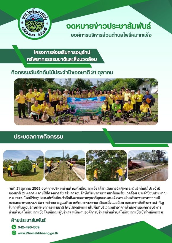 วันที่ 21 ตุลาคม 2568 องค์การบริหารส่วนตำบลโพธิ์หมากแข้ง ได้ดำเนินการจัดกิจกรรมวันรักต้นไม้ประจำปีของชาติ 21 ตุลาคม ภายใต้โครงการส่งเสริมการอนุรักษ์ทรัพยากรธรรมชาติและสิ่งแวดล้อม ประจำปีงบประมาณ พ.ศ.2569 โดยมีวัตถุประสงค์เพื่อน้อมรำลึกถึงพระมหากรุณาธิคุณของสมเด็จพระศรีนครินทราบรมราชชนนี และสนองพระบรมราโชวาทด้วยการดูแลรักษาทรัพยากรธรรมชาติและสิ่งแวดล้อม และตระหนักถึงความสำคัญในการฟื้นฟูอนุรักษ์ทรัพยากรธรรมชาติ โดยได้จัดกิจกรรมในพื้นที่บริเวณหน้าอาคารสำนักงานองค์การบริหารส่วนตำบลโพธิ์หมากแข้ง โดยมีคณะผู้บริหาร พนักงานองค์การบริหารส่วนตำบลโพธิ์หมากแข้งเข้าร่วมกิจกรรม