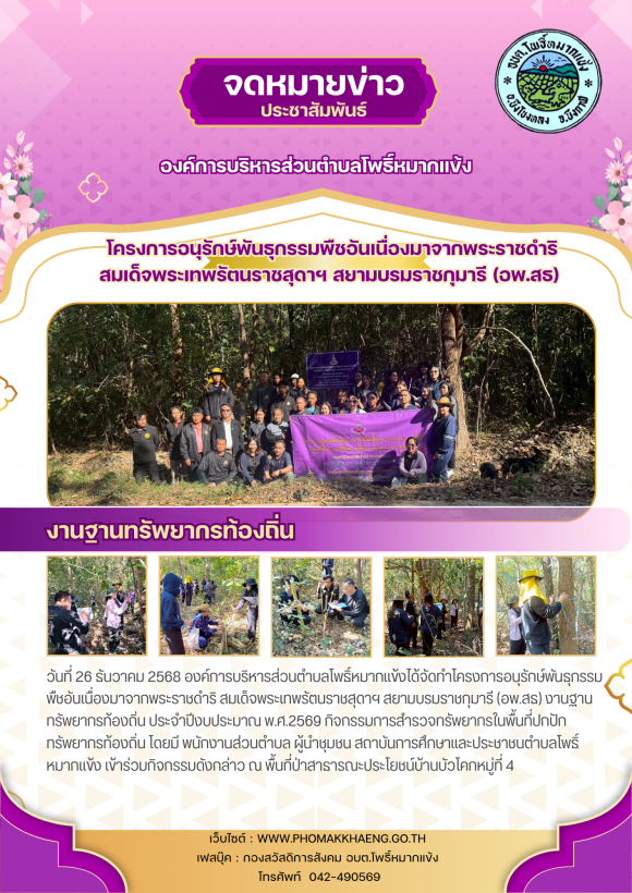กองสวัสดิการสังคม องค์การบริหารส่วนตำบลโพธิ์หมากแข้ง ได้จัดทำโครงการอนุรักษ์พันธุกรรมพืชอันเนื่องมาจากพระราชดำริสมเด็จพระเทพรัตนราชสุดาฯ สยามบรมราชกุมารี (อพ.สธ) งานฐานทรัพยากรท้องถิ่น ประจำปีงบประมาณ พ.ศ.2569 กิจกรรมงานปกปักทรัพยากรท้องถิ่น โดยมีวัตถุประสงค์เพื่อสนองพระราชดำริโครงการอนุรักษ์พันธุกรรมพืชอันเนื่องมาจากพระราชดำริฯ (อพ.สธ.) เพื่อเกิดการสร้างจิตสำนึกในการรักท้องถิ่น เป็นการวางแผนพัฒนาองค์การบริหารส่วนตำบล ณ พื้นที่ป่าสาธารณะประโยชน์บ้านบัวโคก หมู่ที่ 4 โดยมีพนักงานเจ้าหน้าที่ ผู้นำชุมชน สถาบันการศึกษาและประชาชนตำบลโพธิ์หมากแข้งเข้าร่วมโครงการ