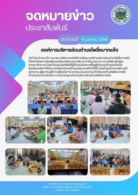 วันที่ 30 มีนาคม ถึงวันที่ 1 เมษายน 2569 กองสวัสดิการสังคม องค์การบริหารส่วนตำบลโพธิ์หมากแข้ง